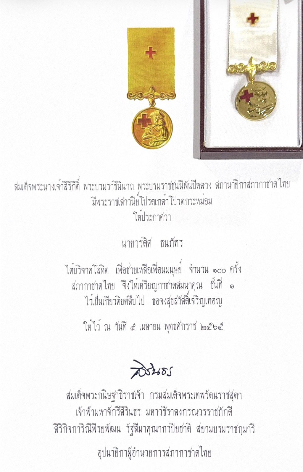 สมเด็จพระกนิษฐาธิราชเจ้า กรมสมเด็จพระเทพรัตนราชสุดา สยามบรมราชกุมารี อุปนายิกาผู้อำนวยการสภากาชาดไทย ทรงพระกรุณาโปรดเกล้าฯ พระราชทานประกาศนียบัตรกำกับเหรียญกาชาดสมนาคุณ ชั้นที่ 1 แก่ ดร.วรดิศ ธนภัทร ณ อาคารภูมิสิริมังคลานุสรณ์ โรงพยาบาลจุฬาลงกรณ์ สภากาชาดไทย